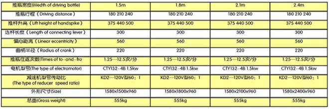 目前国内玻璃厂,以及玻璃器皿厂,退火炉前的推瓶机种类较多,但大多数厂家的推瓶机较复杂。由于玻璃制品车间温度高,生产环境差,在使用过程中,推瓶机易出现故障。个别厂家维修素质差,造成检修时间较长。严重影响正常生产。根据玻璃行业的生产状况,征请了玻璃瓶罐制品业有关专家及科技工作者的提议,将进口推瓶机的极大优点吸收于我厂新型推瓶机研制一种既能符合用户生产工艺要求,结构又极其简单、合理,而且实用性较强的双臂推瓶机,是玻璃制品行业多年来的愿望。